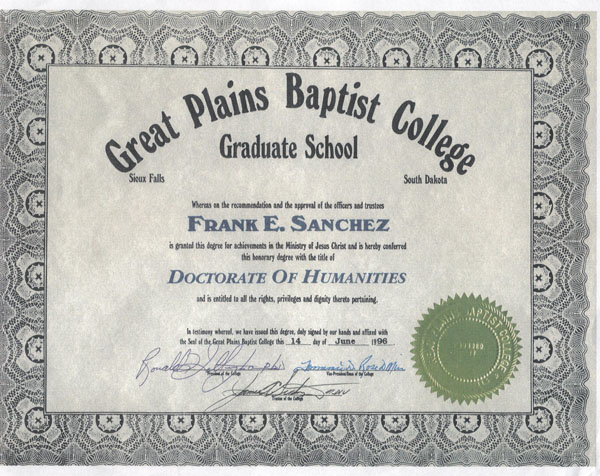 1996 Doctorate of Humanities from Great Plains Baptist College - South Dakota